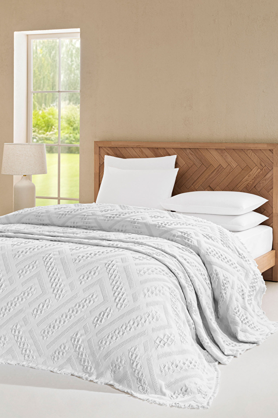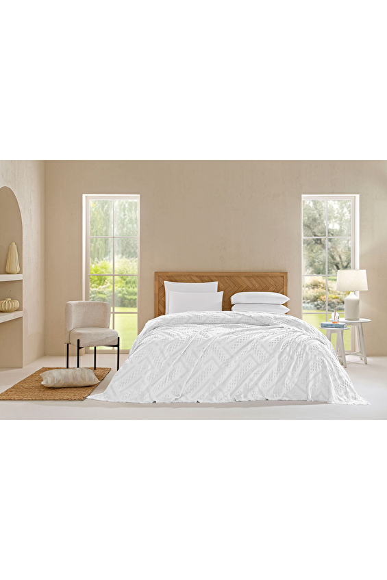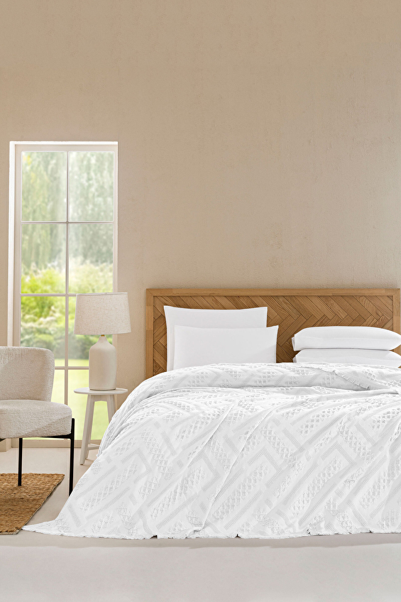 %100 pamuk dokusuyla doğal ve yumuşak bir his veren yatak örtüsü, konfor ve şıklığı bir araya getirerek yatak odanıza zarif bir dokunuş yapar. Özenle işlenmiş kabartmalı desenleri tasarıma derinlik kazandırırken püsküllü kenar detayları bohem bir şıklık sunarak sıcak, samimi ve özgün bir atmosfer oluşturur. Estetik görünümü, kaliteli dokusu ve nefes alabilen yapısıyla dört mevsim boyunca rahatlıkla kullanılabilir.