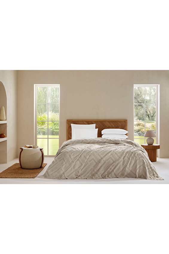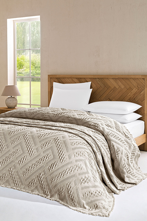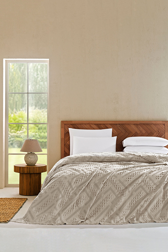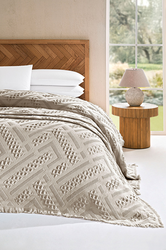 %100 pamuk dokusuyla doğal ve yumuşak bir his veren yatak örtüsü, konfor ve şıklığı bir araya getirerek yatak odanıza zarif bir dokunuş yapar. Özenle işlenmiş kabartmalı desenleri tasarıma derinlik kazandırırken püsküllü kenar detayları bohem bir şıklık sunarak sıcak, samimi ve özgün bir atmosfer oluşturur. Estetik görünümü, kaliteli dokusu ve nefes alabilen yapısıyla dört mevsim boyunca rahatlıkla kullanılabilir.