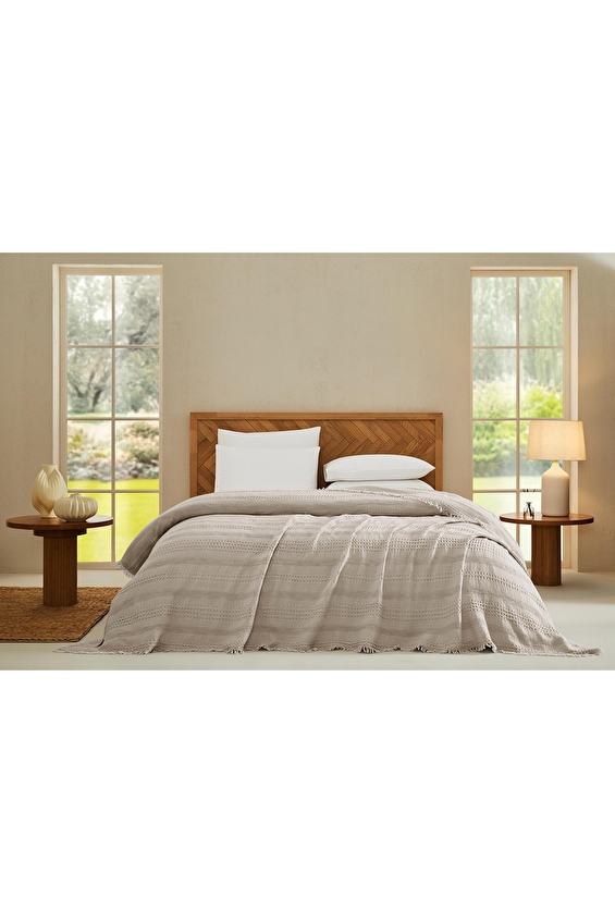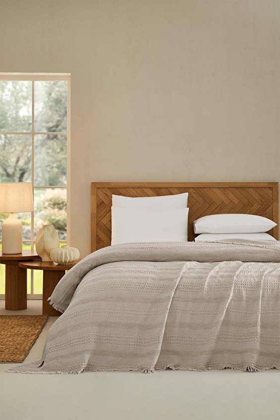 Konfor ve şıklığı bir araya getiren yatak örtüsü, yatak odanıza zarif bir dokunuş yapar. %100 pamuk dokusuyla yumuşacık bir his verir. Özenle işlenmiş kabartmalı desenleri tasarıma derinlik kazandırır. Püsküllü kenar detayları ise bohem bir şıklık sunar. Kaliteli dokusu, estetik görünümü ve nefes alabilen yapısıyla dört mevsim boyunca rahatlıkla kullanılabilir.