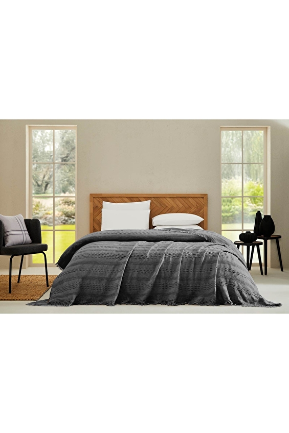 Konfor ve şıklığı bir araya getiren yatak örtüsü, yatak odanıza zarif bir dokunuş yapar. %100 pamuk dokusuyla yumuşacık bir his verir. Özenle işlenmiş kabartmalı desenleri tasarıma derinlik kazandırır. Püsküllü kenar detayları ise bohem bir şıklık sunar. Kaliteli dokusu, estetik görünümü ve nefes alabilen yapısıyla dört mevsim boyunca rahatlıkla kullanılabilir.
