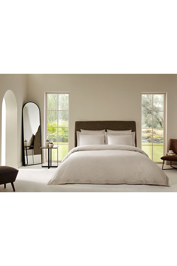 Pamuğun yumuşacık dokusuyla ketenin serinletici ve dayanıklı yapısını bir araya getirerek cildinize nefes aldıran ve dört mevsim konfor sağlayan bir his sunar. Zarif dokuma deseni yatak odanıza modern bir hava katar. Saten detaylarıyla görünümünü tamamlayan nevresim takımı, sade şıklığı sevenler için ideal bir seçimdir.