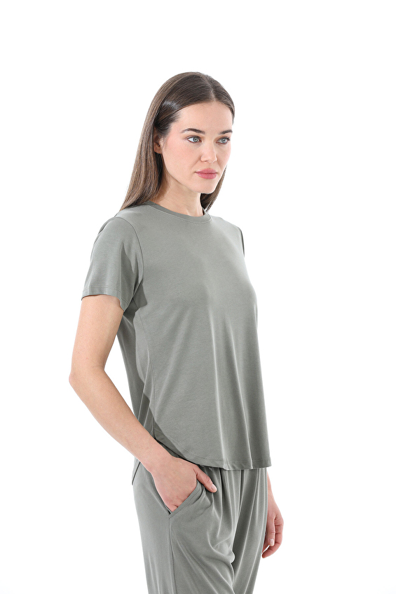 Hafif ve esnek yapısıyla rahatlığı ön planda tutarak evdeki dinlenme anlarınızı daha keyifli hâle getirir. Kısa kollu üst tasarımı ve rahat kesimiyle hem şık hem işlevsel bir kullanım sağlarken haki tonuyla sade ama zarif bir görünüm sunar.