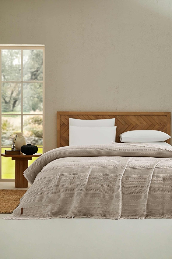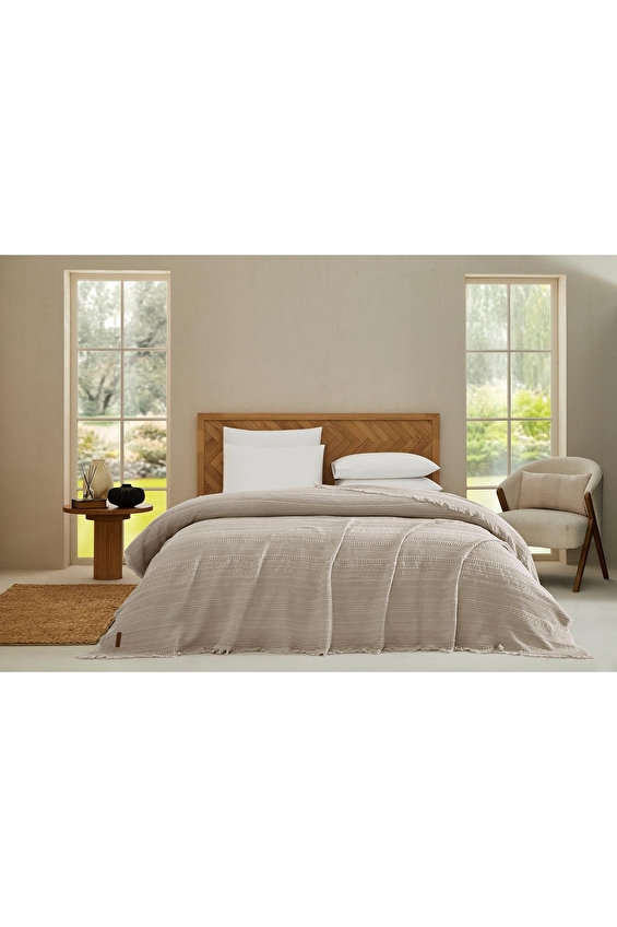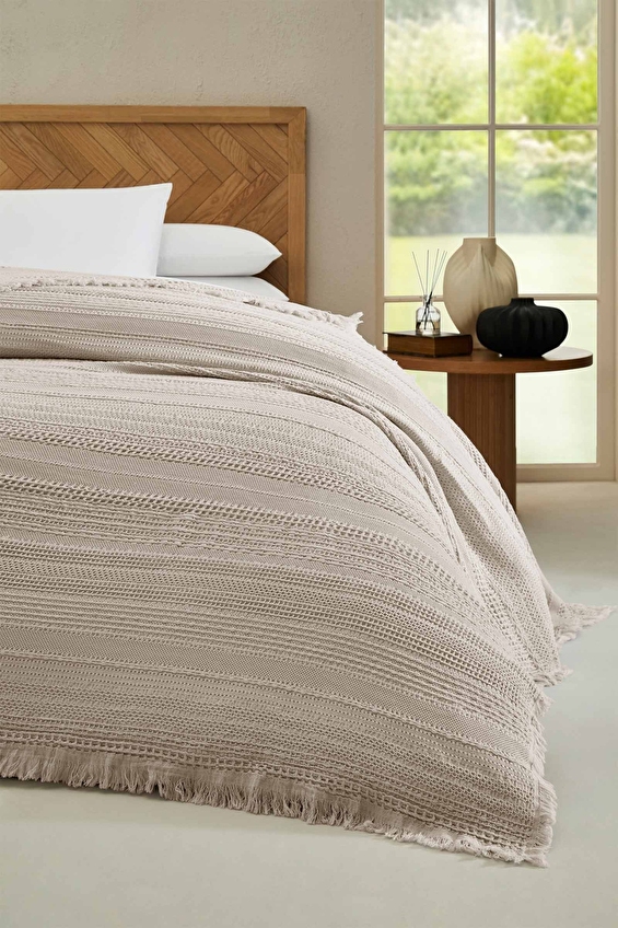 Yumuşacık dokusu ve özgün tasarımıyla yatak odanızda şık bir görünüm sağlar. Zarif püsküllü detaylarıyla bohem bir atmosfer oluşturur. Nefes alabilen %100 pamuk yapısı sayesinde dört mevsim rahatlıkla kullanılabilir.